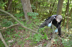 Jean-Marc Bonzom fait une trouée dans la forêt pour pouvoir installer un filet japonais. © Audrey Sternalski/IRSN