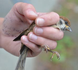 Capture d'un moineau. Le jaune autour du bec révèle que c'est un juvénile né cette année !
