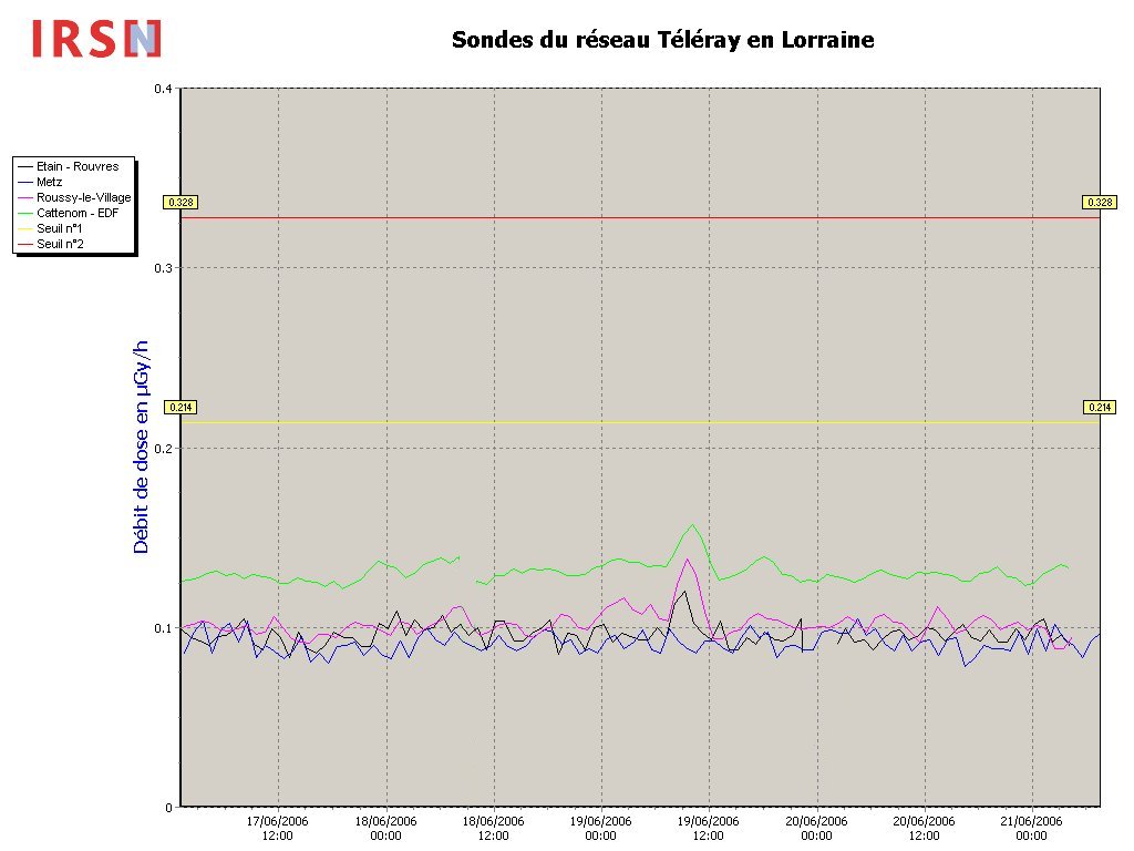 De son côté, l’IRSN, qui exploite le réseau national de télésurveillance du rayonnement gamma ambiant (TELERAY) n’a observé aucune élévation du débit de dose ambiant sur les balises de ce réseau situées en Lorraine, dans les villes d'Etain, Metz, Cattenom et Roussy-le-Village durant la période allant du samedi 17 juin au mardi 20 juin 2006.