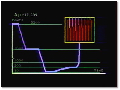 La seconde partie (de 4 min 45 à 8 min 38) revient sur le déroulé technique de l’accident avec notamment des images de synthèse et des graphiques. Le récit de l’accident est assez neutre et il n’y pas d’indications spécifiques sur les causes profondes. Les fonctions des opérateurs/responsables réalisant différentes actions lors de la séquence accidentelle sont toutefois mentionnées, par exemple « sur ordre du contrôleur du réseau électrique » ou encore « sur ordre du chef d’équipe ». Le récit de l’accident est accompagné d’un graphique animé (Figure 2), montrant en abscisse le temps (la journée du 25 avril et la nuit du 25 au 26 avril 1986) et en ordonnée la puissance du réacteur. L’animation se termine sur la réalisation d’un test le 26 avril 1986 à 1 h 23 min 04 s, puis à l’explosion du réacteur numéro 4 quelques dizaines de secondes plus tard.