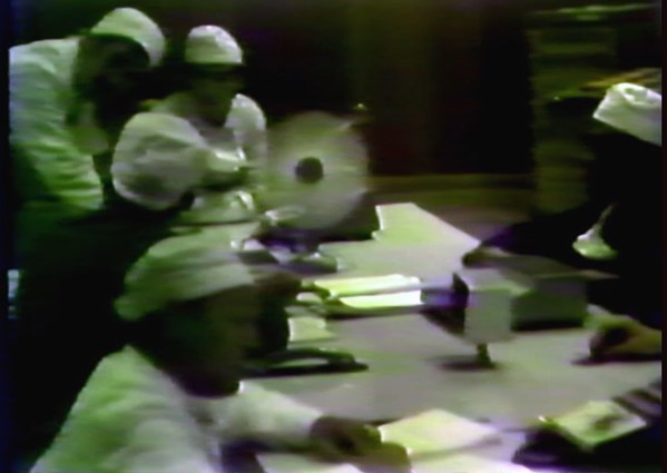 Enfin, la dernière partie (11 min 25 s jusqu’à la fin) est tournée vers l’avenir et se veut résolument optimiste. La vidéo explique que « dès la fin du mois de mai, la situation s’est stabilisée ». Cette partie présente des images des éléments accidentés et/ou détruits (pompes de circulations principales et salle des turbines de l’unité 4) et des éléments des autres réacteurs non accidentés. En particulier, la vidéo montre que, si le réacteur 4 est accidenté, le reste de la centrale est encore opérationnel. Il est notamment expliqué qu’« au début du mois de juin, les spécialistes ont pu déjà travailler dans beaucoup de ces locaux ». Après un passage vers la salle des turbines endommagée de l’unité 4, on présente les salles des turbines des réacteurs 1 et 2 comme « prêtes au fonctionnement » avec du personnel au travail, en blouse blanche mais sans tenue spécifique de protection. La salle de commande du réacteur 1 est visible avec des opérateurs au travail. La voix-off indique qu’« on travaille dans la salle de contrôle des unités 1 et 2 jour et nuit dans le régime d’attente ». Les seuls individus visibles dans le film sont donc des opérateurs au travail (Figure 4). L’accent est clairement mis sur une forme de « normalité » dans le travail en cours à la centrale de Tchernobyl. Aucun des opérateurs ne semble porter de masque ou de protections spécifiques contre la radioactivité.