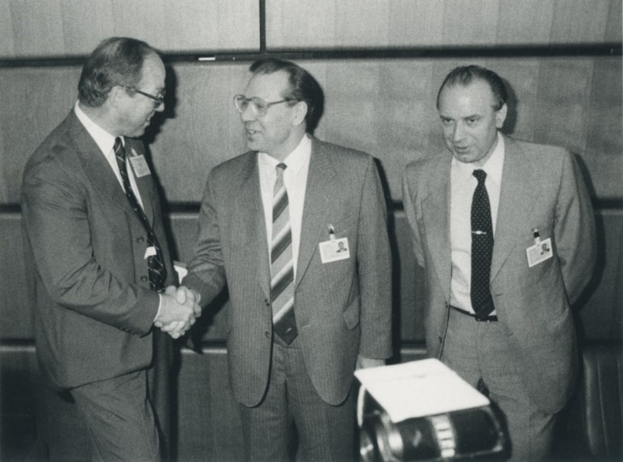 Figure 6 : Archives de l'AIEA, conférence de presse tenue lors du Post-Accident Review Meeting on the Chernobyl accident : Hans Blix, directeur général de l'AIEA (à gauche), serre la main de M. V.A. Legasov, premier directeur adjoint de l'Institut de l'énergie atomique Kurchatov, URSS. 1986, Katholitzky, Stefan (copyright), IAEA-ARC-AV-PH-01-02-A2789-003.