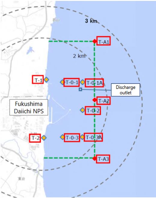 Figure 14 : localisation des sites de prélèvements d’eau de mer qui font l’objet de mesures de tritium. Le point T-0-1A est celui situé au plus près de l’émissaire de rejet (discharge outlet) situé à un kilomètre au large de la centrale de Fukushima Daiichi. C’est celui qui montre les niveaux de tritium les plus élevés lors des campagnes de rejets. (source : Fukushima Revitalization Information Portal Website)