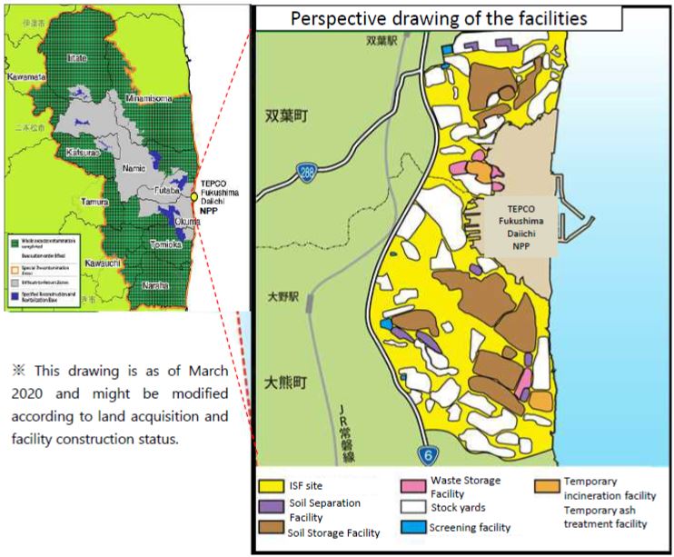 À partir de 2016, les déchets stockés sur ces sites d’entreposage temporaires ont été progressivement transférés par camion vers un site d’entreposage intermédiaire, l’ISF (Interim Storage Facility). L’ISF est situé en bordure du site de la centrale nucléaire de Fukushima Daiichi, à cheval sur les communes d’Okuma et de Futaba, et s’étend sur une superficie d’environ 1 600 hectares (figure 8). Il accueille par ailleurs les déchets issus des opérations de décontamination des zones SRRBA et SLAR.
