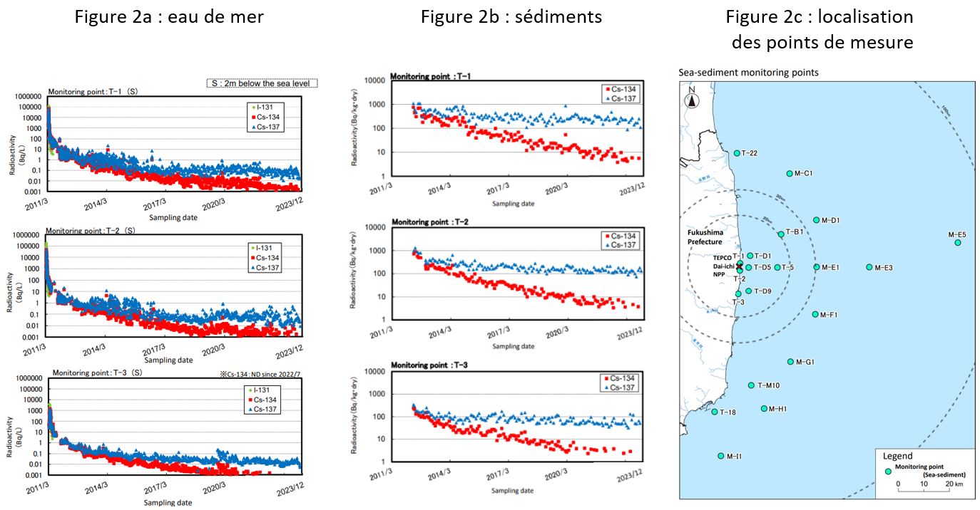 L’accident de la centrale de Fukushima Daiichi a conduit, en mars et avril 2011, au déversement direct dans l’océan Pacifique, d’environ 3,5 PBq (1PBq = 1015 Bq) de césium-137 et de césium-134. La figure 2 présente l’évolution de l’activité de ces deux radionucléides entre 2011 et 2023 pour trois points de prélèvements situés à proximité immédiate de la centrale de Fukushima Daiichi. Après avoir dépassé plusieurs dizaines de milliers de Bq/L en 2011, les niveaux actuels sont compris entre 0,01 et 0,1 Bq/L pour le césium-137 et un ordre de grandeur inférieur pour le césium-134. A plus grande distance de la côte (> 20 km, points M), les concentrations en césium-137 sont de l’ordre de 0,001 Bq/L. Celles-ci sont du même ordre de grandeur que celles qui étaient observées le long des côtes japonaises avant l’accident et qui avaient pour origine principale les retombées des essais nucléaires atmosphériques.