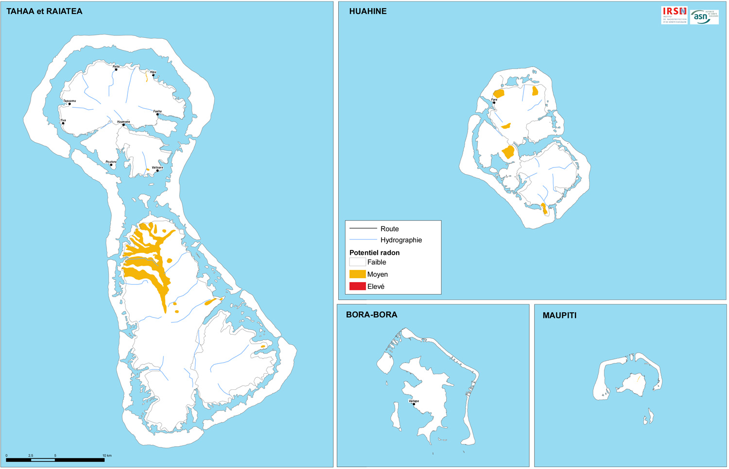 | La Polynésie : Dans le cadre de la cartographie du potentiel radon, seules les îles habitées ont été traitées. Les cartes ci-dessous ont été réalisées pour les îles disposant de cartes géologiques. Pour les autres îles, le potentiel radon est homogène et faible. |