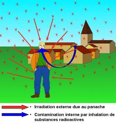 - l’irradiation externe par le rayonnement émis par les radionucléides émetteurs gamma dispersés dans l’air (sous forme de gaz ou de fines particules en suspension appelées « aérosols »), y compris ceux présents en hauteur ;