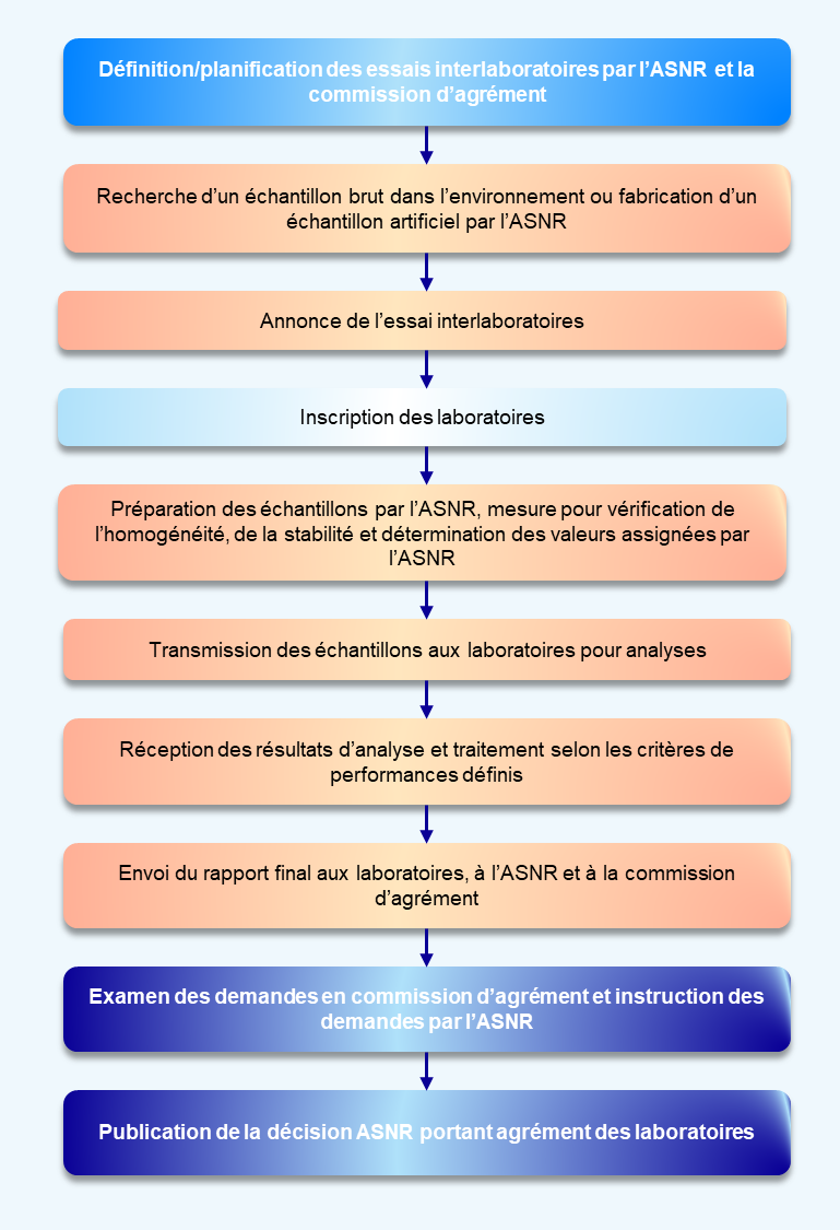 Outre un dossier complet démontrant la conformité de leur organisation et de leurs pratiques, les laboratoires doivent participer aux essais organisés par l’ASNR qui ont pour but d’éprouver la compétence technique de laboratoires. Il s’agit généralement de tests d’aptitude qui consistent à comparer les résultats obtenus par les laboratoires sur des échantillons identiques à une valeur assignée (valeur de référence définie par l’ASNR). Les essais organisés par l’ASNR concernent la mesure de radionucléides émetteurs bêta et gamma, émetteurs bêta purs et émetteurs alpha artificiels, ainsi que les radionucléides des chaînes naturelles de l’uranium, du thorium et du radium et de l’uranium pondéral, soit plus de 43 types d’essais différents.