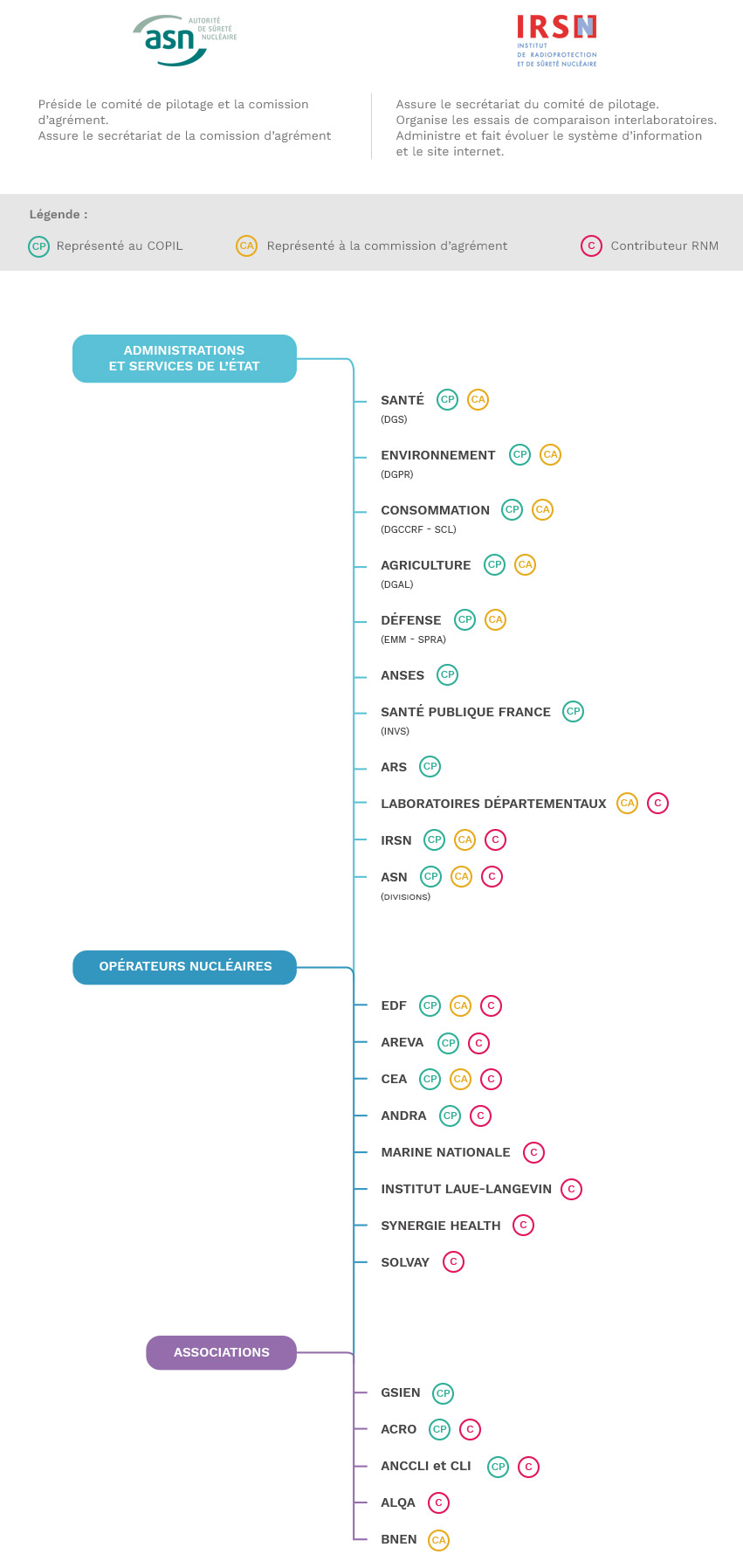 Le réseau national est animé par un comité de pilotage placé sous la présidence de l’ASN, chargé de définir les orientations stratégiques du réseau. En complément, une commission d’agrément émet un avis sur les demandes des laboratoires qui sollicitent l’agrément de l’ASN. Les différents acteurs du RNM sont représentés dans ces deux instances.