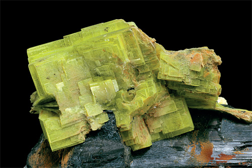 | Sa couleur jaune rend facilement identifiable l’autunite, qui renferme naturellement de l’uranium (Source: MNHN/Galerie de minéralogie/D. Bayle). | La monazite est la source principale de thorium, un métal radioactif (Source: Wikimedia Creative Commons/Aangelo). |