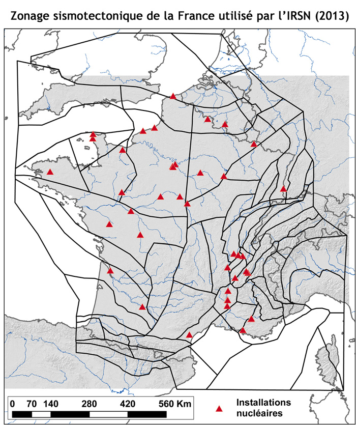 Dans le contexte de sismicité faible à modérée de la France métropolitaine, les failles susceptibles de générer des séismes ne sont pas toutes identifiées. Compte tenu de ce manque de connaissance, la RFS 2001-01 demande d’analyser les données géologiques et sismologiques et de définir des zones (dites zones sismotectoniques) considérées comme homogènes du point de vue de leur potentiel à générer des séismes. Dans les zones sismotectoniques ainsi définies, on considère que, pour une zone donnée, tous les séismes qui s’y sont produits peuvent s’y reproduire à l’avenir en n’importe quel endroit de la zone. La figure 1 présente le zonage sismotectonique de la France le plus récent utilisé par l’IRSN dans le cadre de ses travaux d’analyse des dossiers de sûreté des exploitants, effectués pour le compte des autorités. Ce zonage est régulièrement mis à jour afin d’intégrer les nouvelles connaissances issues, soit de travaux de recherches menés par l’IRSN, soit de travaux menés par d’autres organismes, dont les exploitants, ou des équipes universitaires.