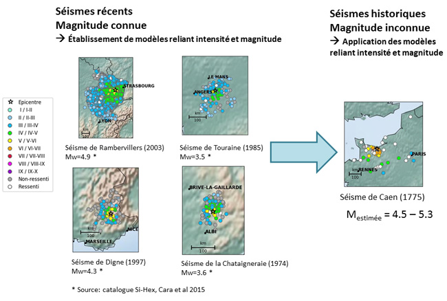 Figure 3 : Estimation de la magnitude pour des séismes historiques. Des modèles reliant la répartition géographique des intensités macrosismiques et la magnitude sont établis à partir de l’analyse de séismes récents français et européens. Ces modèles sont ensuite appliqués aux séismes historiques pour lesquels la seule information disponible est l’intensité. Cette approche permet ainsi une estimation de la magnitude. La profondeur du foyer des séismes historiques est obtenue en mettant en œuvre ces mêmes modèles.