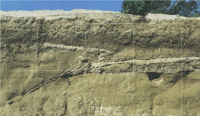Figure 4 : Exemple d’indice de paléoséisme (Courthézon) sur la faille de Nîmes. Les couches géologiques superficielles ont été décalées par le jeu de la faille, ce qui atteste de son activité. Le déplacement de la couche soulignée, le long du plan de faille, mesure environ 1 m, ce qui selon certaines relations empiriques, aurait été créé par un séisme de magnitude 6,5 ± 0,3. (Photo IRSN)
